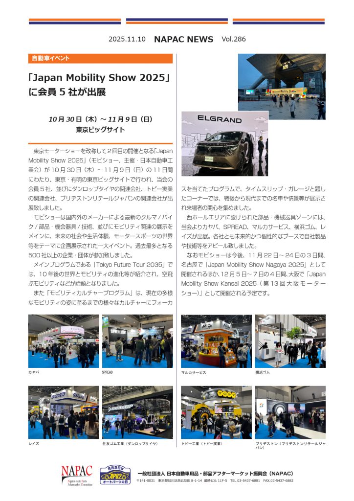 東京モーターショーを改称して2回目の開催となる「Japan Mobility Show 2025」(モビショー、主催・日本自動車工業会)が10月30日(木)~11月9日(日)の11日間にわたり、東京・有明の東京ビッグサイトで行われ、当会の会員5社、並びにダンロップタイヤの関連会社、トピー実業の関連会社、ブリヂストンリテールジャパンの関連会社が出展致しました。