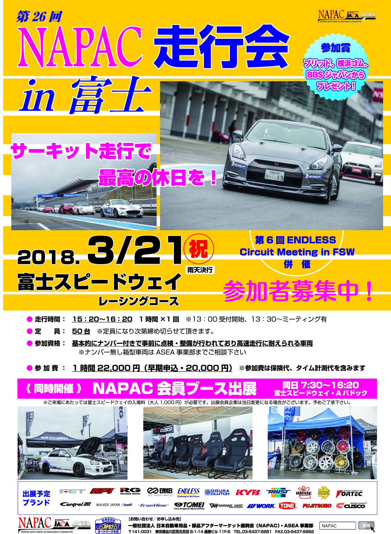 当会が主催する第26回NAPAC走行会(3月21日開催)の参加者募集を開始いたしました。