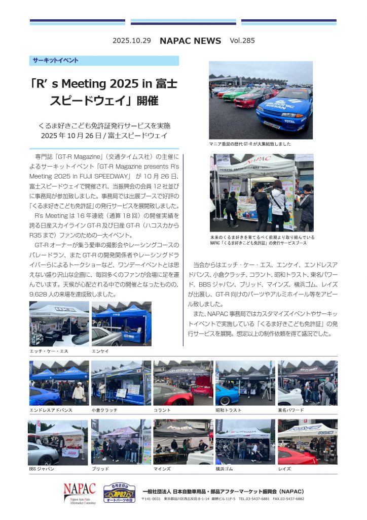 専門誌「GT-R Magazine」(交通タイムス社)の主催によるサーキットイベント「GT-R Magazine presents R’s Meeting 2025 in FUJI SPEEDWAY」が10月26日(日)、富士スピードウェイで開催され、当振興会の会員12社並びに事務局が出展致しました。事務局では出展ブースで好評の「くるま好きこども免許証」の発行サービスを展開致しました。